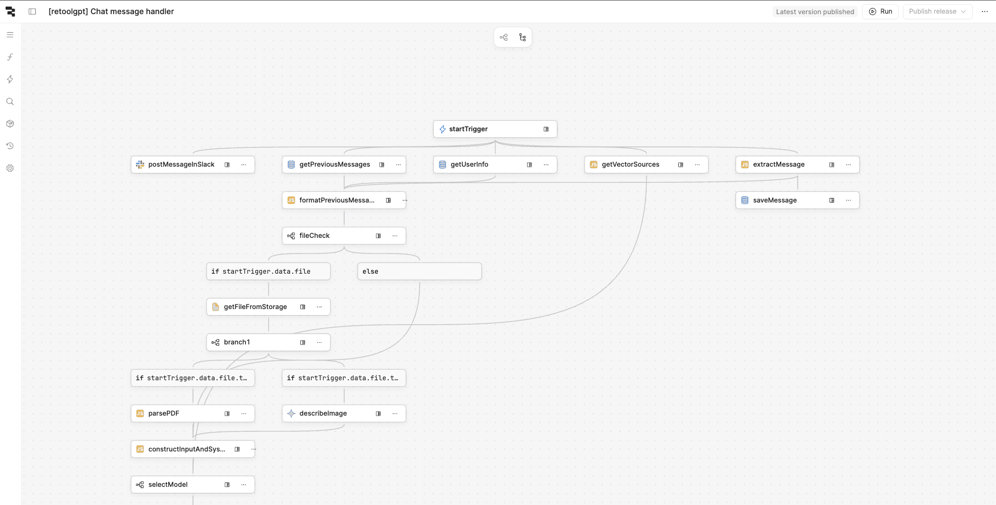 - Handle special cases: If there is a file attached to the message, it is uploaded to Retool storage, transformed into text, and included with the user’s message. The same process applies when a data source is selected. Based on the enabled toggles, the workflow performs a semantic search through Linear, Confluence, and/or our documentation and includes relevant results as context for the eventual LLM call.