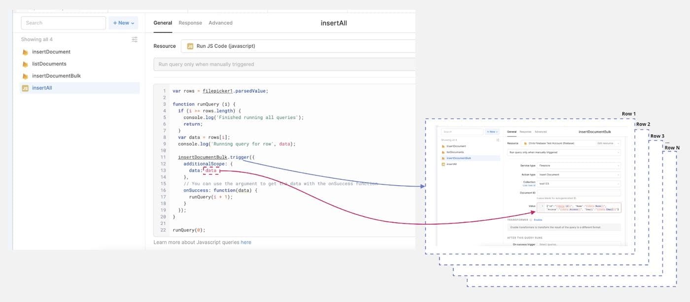 The `insertDocumentBulk` query will receive the data from that loop for each iteration and insert each individual row.