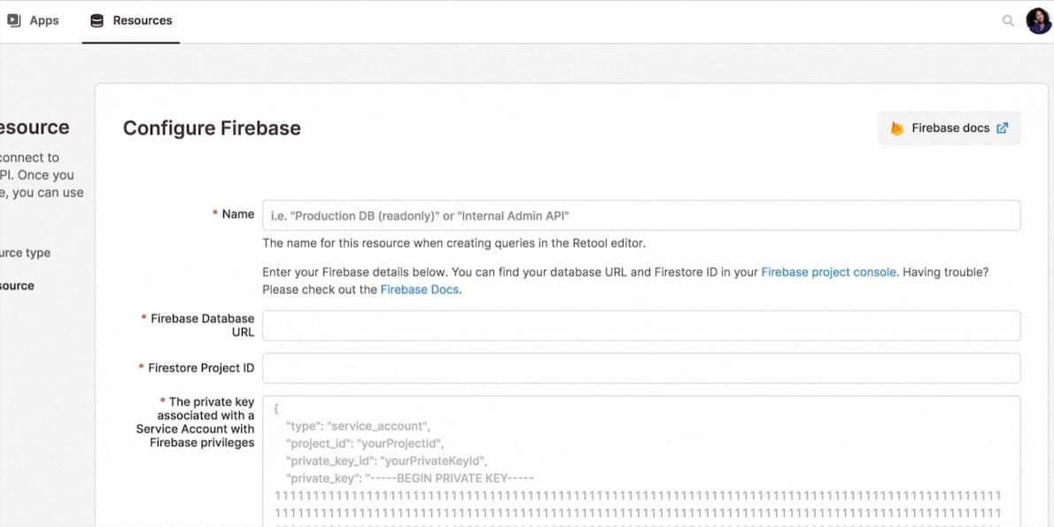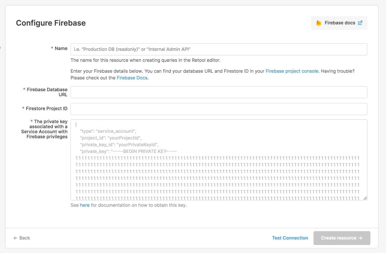 In Firebase, go back to the Project settings and click on the Service accounts tab. Hit the "Generate new private key" button. Copy it, then paste it into the "Configure" screen in Retool.
