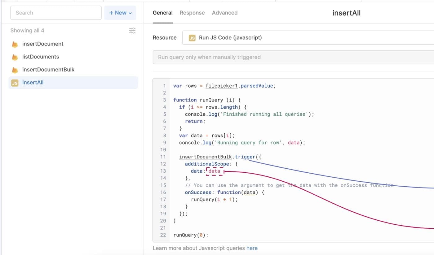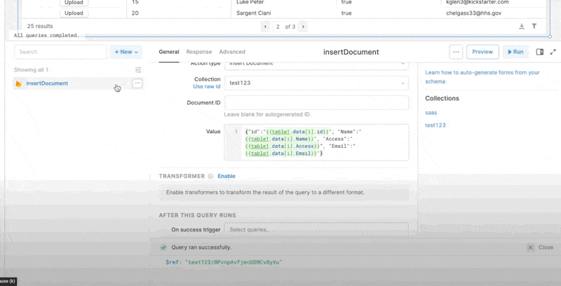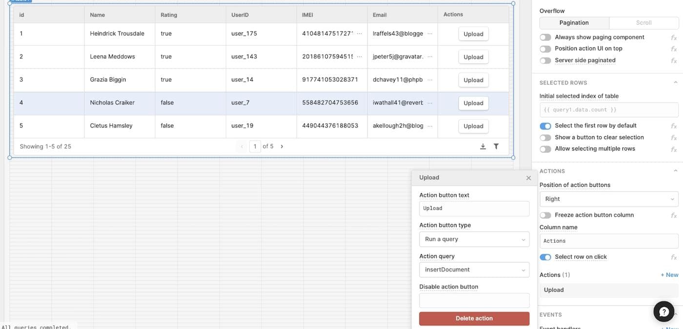 Finally, link the table’s upload button action to the “insertDocument” query, which will trigger the query to execute and upload row data to your resource.