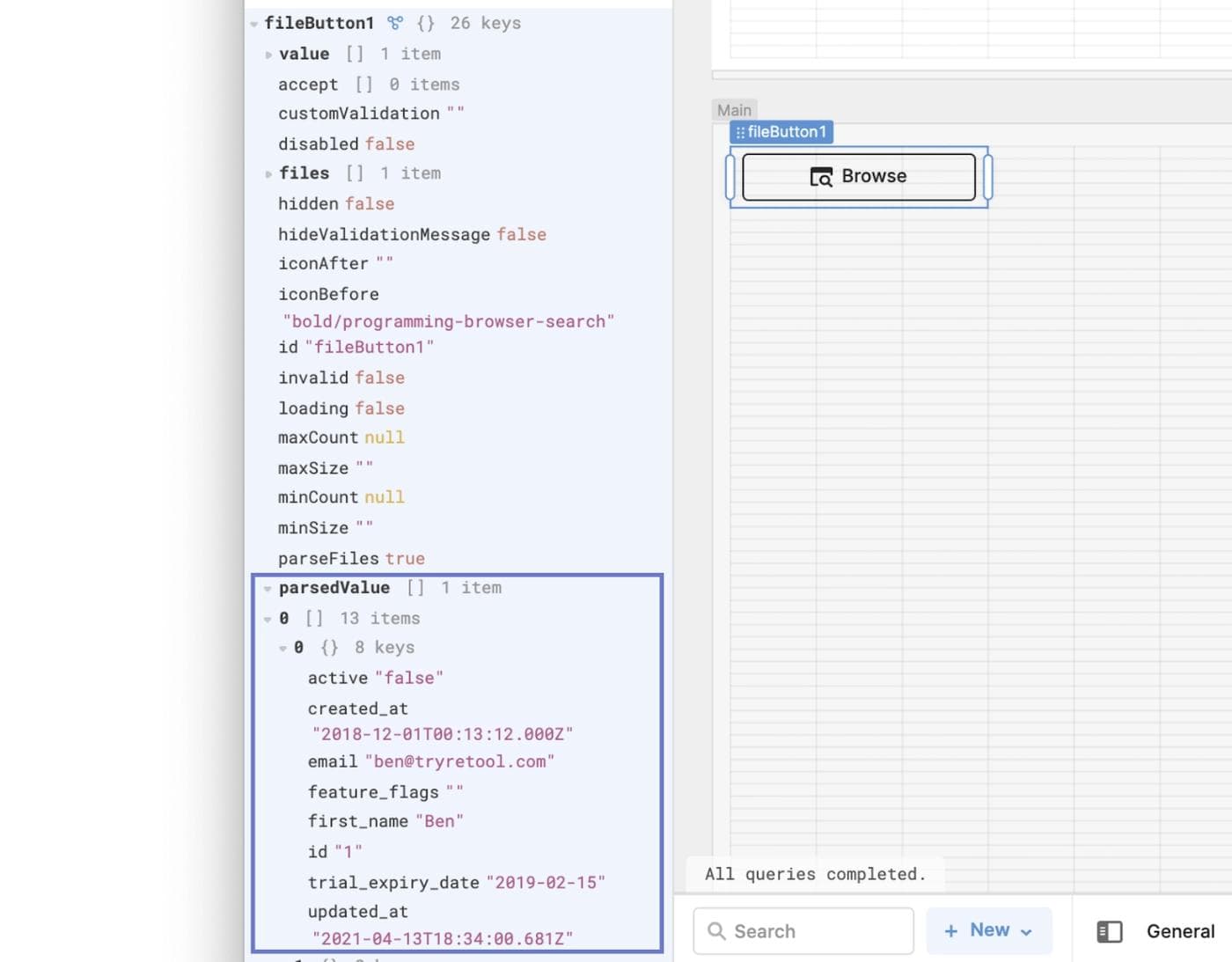 In the left-hand panel, you'll see your CSV's parsed data by selecting the `fileButton1` component and expanding the `parsedValue` property.
