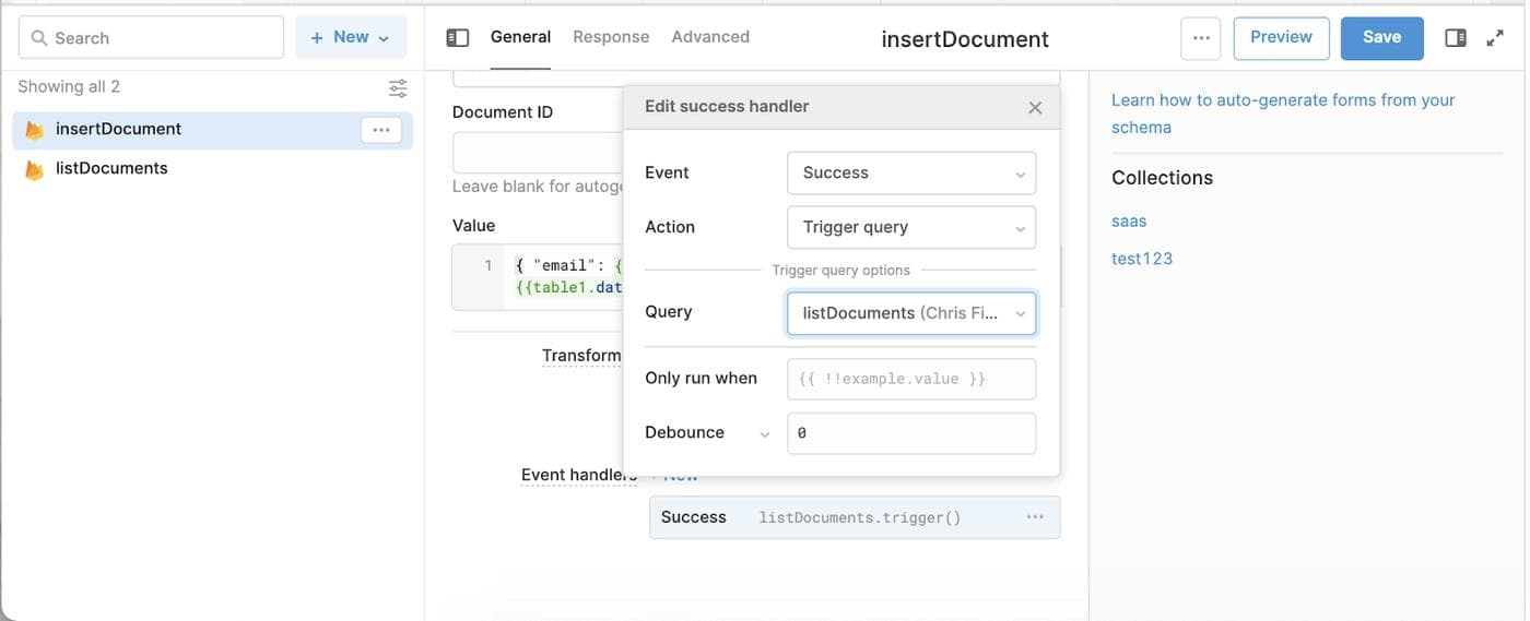 To do this, select your `insertDocument` query in the bottom panel and create an event handler for the “Success” event so that each time you successfully insert a document, the Firestore table will automatically be refreshed. From the event handler success trigger dropdown select the `listDocuments` query.