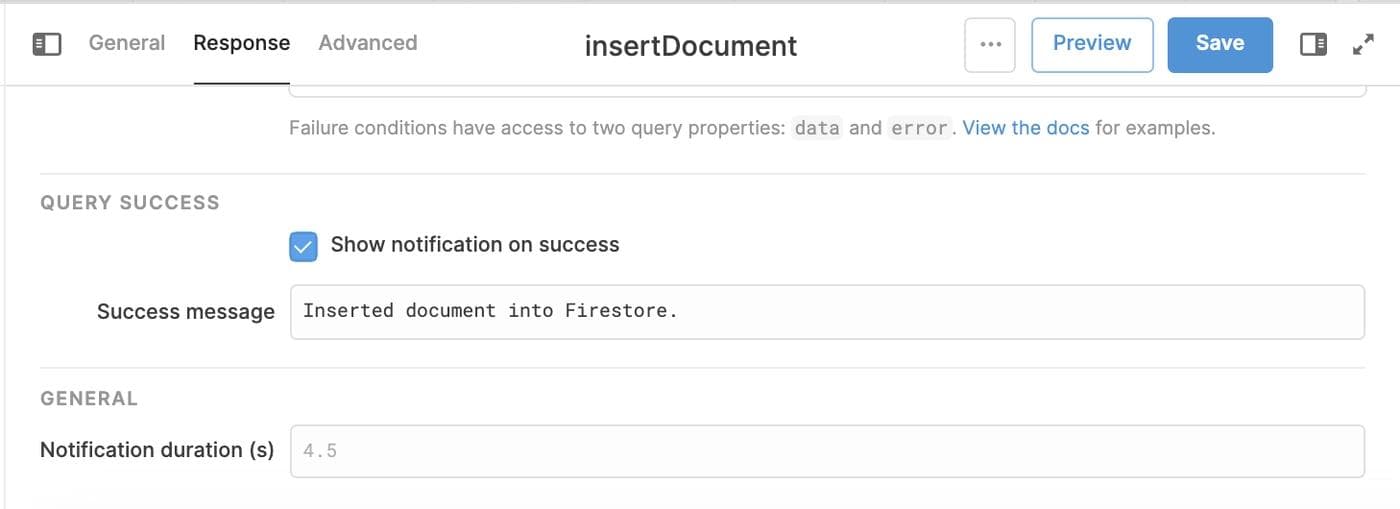 Now, write whatever success message you want to be shown to your user when a successful query runs. (In the example, we're using "Inserted document into Firestore." )