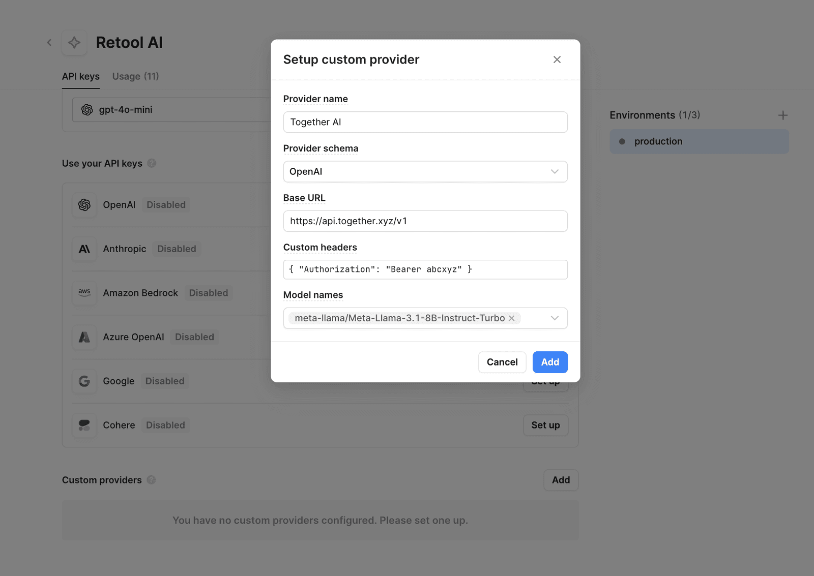 Now, you can connect a custom AI provider in Retool to integrate your preferred third-party AI services, use custom language models, and meet stringent security and compliance requirements through your own proxies. This feature supports various AI provider schemas, allowing you to choose and implement AI solutions for your specific needs and preferences. Learn how to connect your own custom AI provider here.