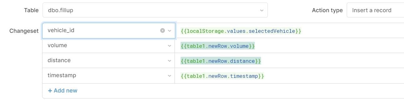 When you open the new row editor, the values in the editor are added to the table’s newRow property. You can use this property to populate the database’s new record columns. Add values for vehicle_id, volume, distance, and timestamp in the editor using the corresponding properties from newRow.