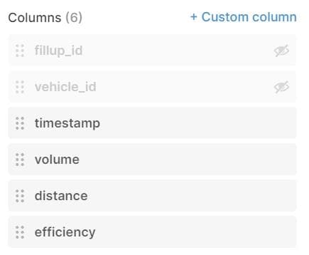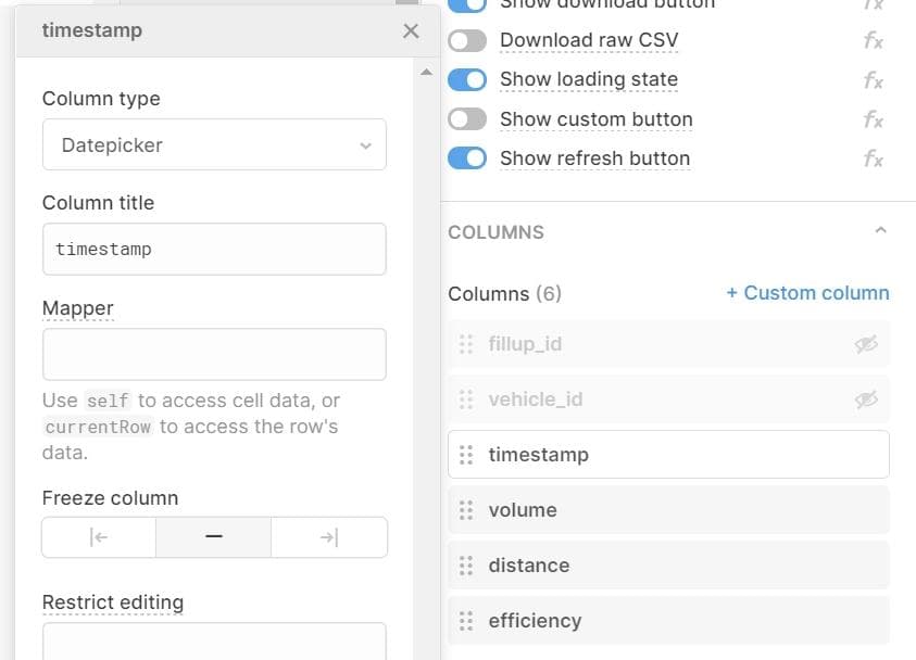 All of the columns are non-editable by default. To change that, go back to the Columns section in the inspector. Select the timestamp column and set its Column type to Datepicker. Continue down the list, setting volume and distance to “Float” column types, and toggle the Make Editable switch on both.