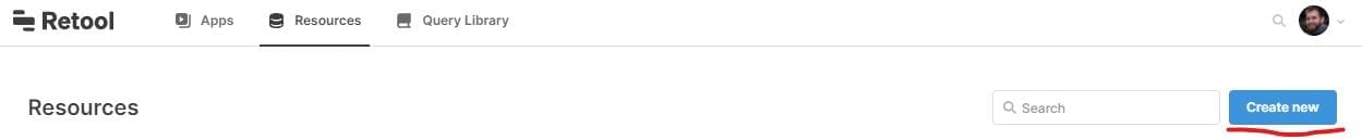 Before you can start on your user interface, you’ll need to configure Retool to connect to your database. To do this, go to the Retool console, open the Resources tab and click Create New.