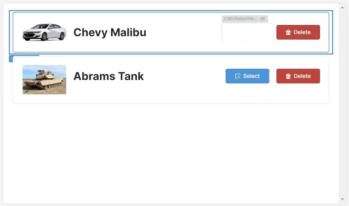 In the inspector, go to the Layout section. Set the “Hidden” property so that when the selected vehicle is equal to the current vehicle’s id, it resolves to true: {{localStorage.values.selectedVehicle == ListVehicles.data.vehicle_id[i]}}.