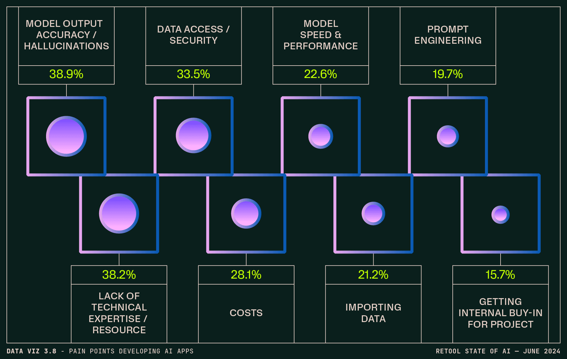 - Two of the top three pain points respondents associated with developing AI apps were model output accuracy/hallucinations (38.9%) and data access/security (33.5%) which have remained largely unchanged from 2023’s survey.