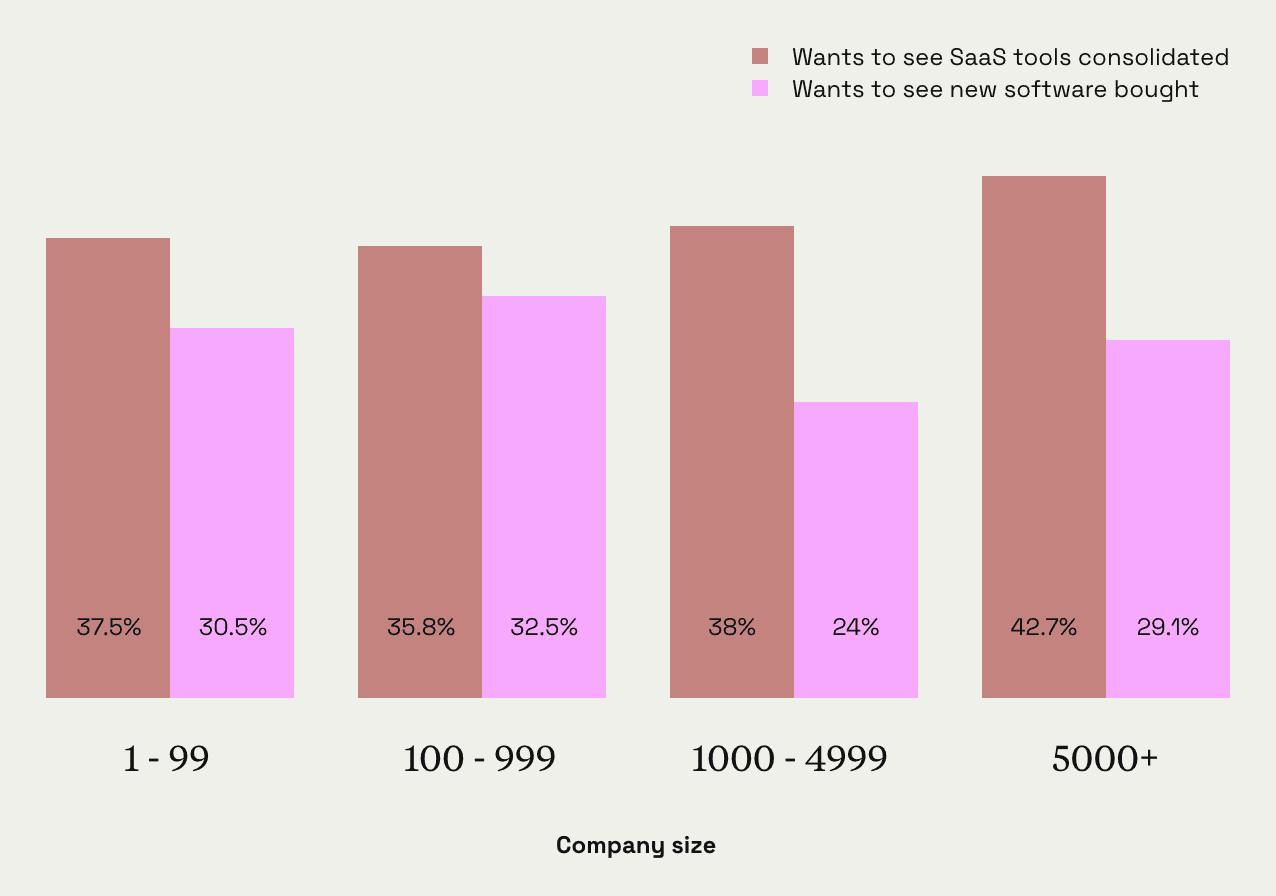 But even getting more granular, things still skew consolidate. Only respondents working on solo projects (4%) or at companies in the 500–999 range (.69%) had a slight preference for more software.