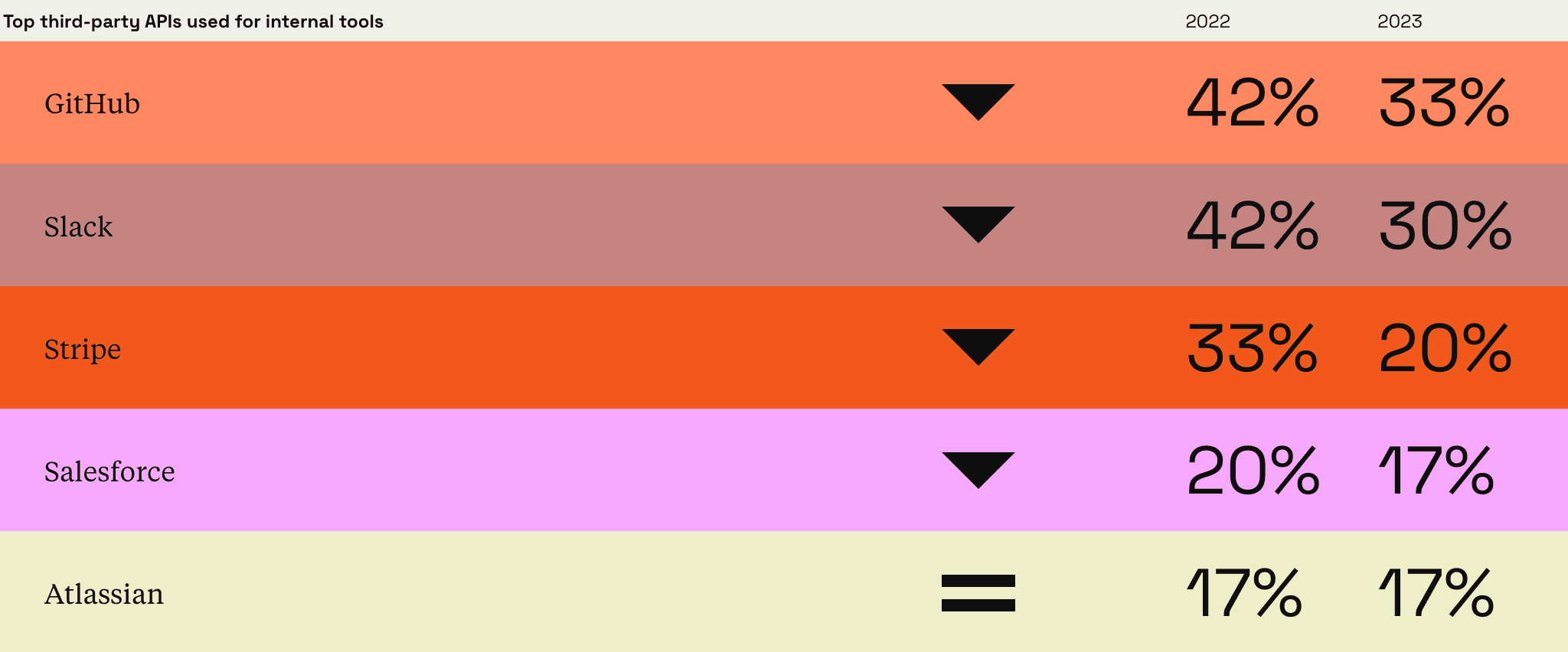 The data sources used for internal tools saw, perhaps, a little consolidation: internal databases stayed in first place (78%, down slightly from 82% in 2022), followed by internal APIs like REST and gRPC (56%, down from 63%), and third-party APIs (45%, up slightly from 44%). And getting a little more granular, there was a little moving and shaking amongst the top DBs and APIs, as you’ll see here: