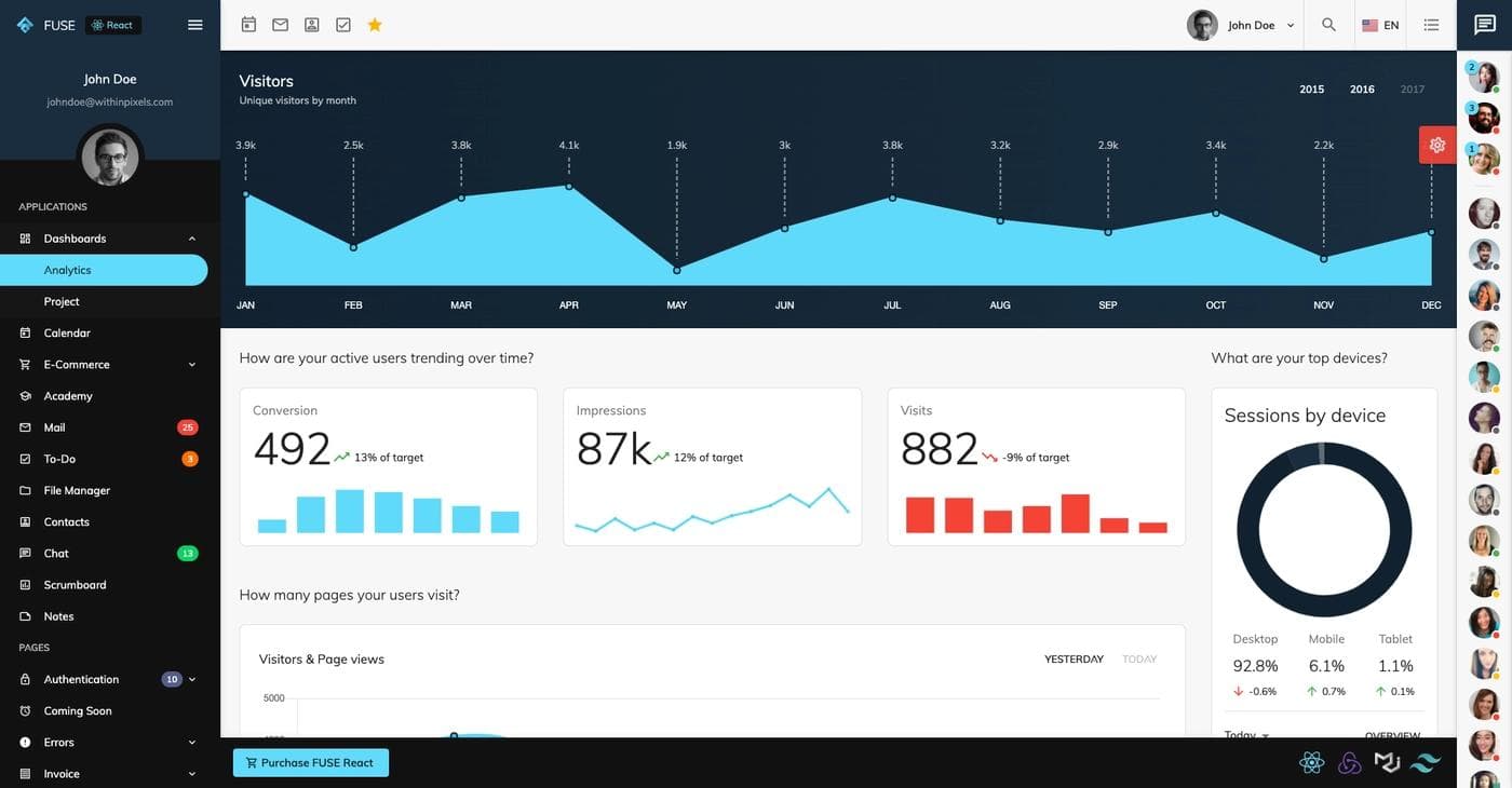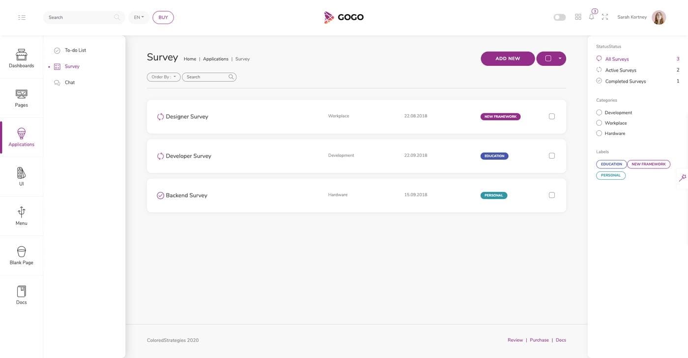 Many of the React admin templates in this list have some combination of prebuilt applications to start off with, from ecommerce to messaging and to-do applications. Gogo is the only React admin template that has a survey app template.