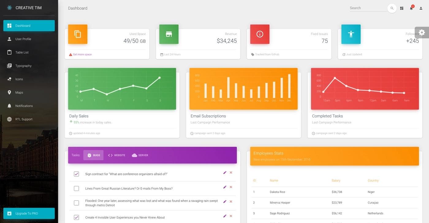 Every React admin template in this list is priced over $20 (except for one $9 one). If you’re on a tight budget, Material Dashboard React has a free tier. While the paid version includes 200 UI components and eight sample apps, the free version still has 30 UI components available and seven sample apps, so you’re still got a bunch to work with.