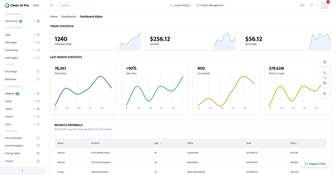 Many of the React admin templates in this list are built on the principles from Material Design, a design language developed by Google, but Clean UI is based on Ant Design, a design language and framework aimed at enterprise applications. Clean UI has exactly what the name states: a clean user interface that’s not overcomplicated with lots of colors and themes.
