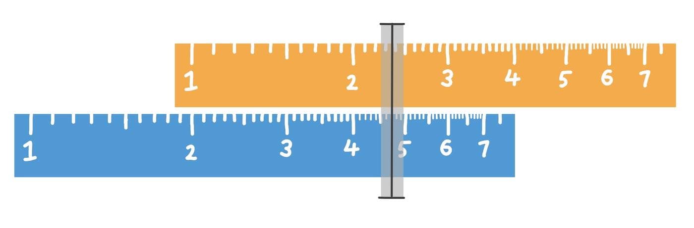 This is the slide rule v1.0 — two sliding sticks with logarithmic scales. Different calculations can be carried out by sliding the sticks by different amounts.