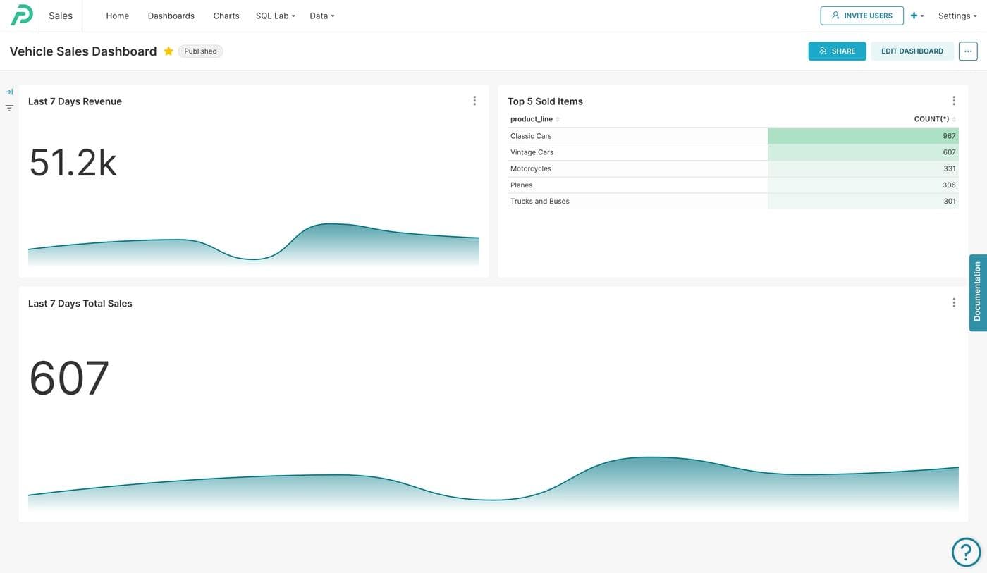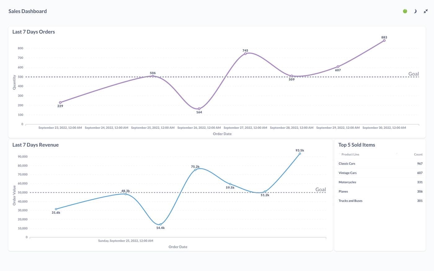 Once set up, you'll end up with the following dashboard with three components, showing three different cuts of the data: the last seven days' revenue, the last seven days' total sales, and the top five selling products.