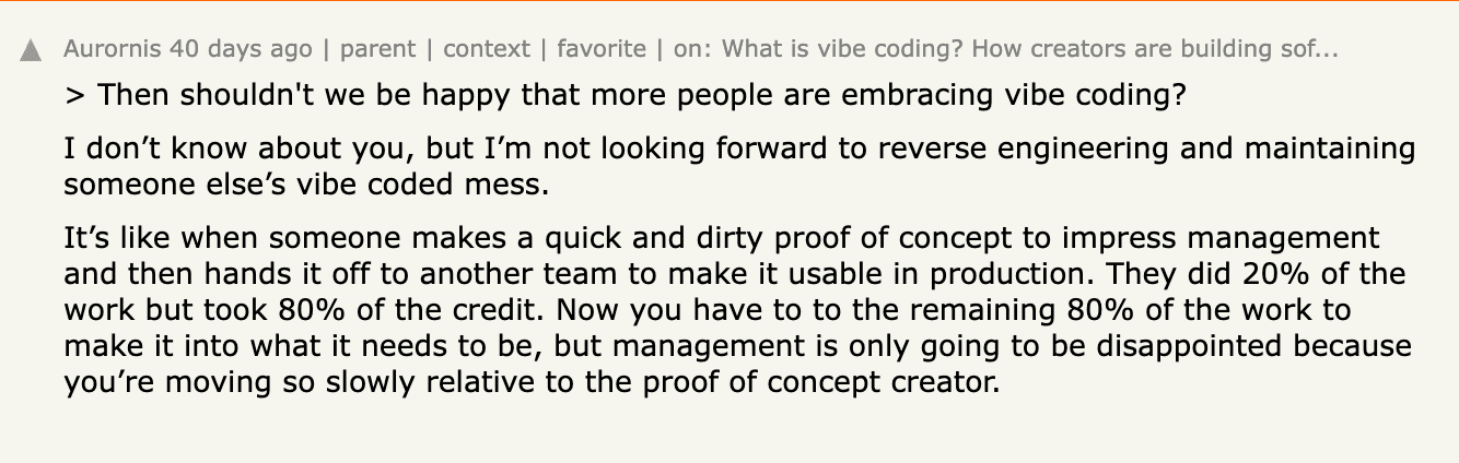 “Vibe Coding” might get you 80% the way to a functioning concept. But to produce something reliable, secure, and worth spending money on, you’ll need experienced humans to do the hard work not possible with today’s models.” – Cendyne Naga, "Vibe Coding" vs Reality